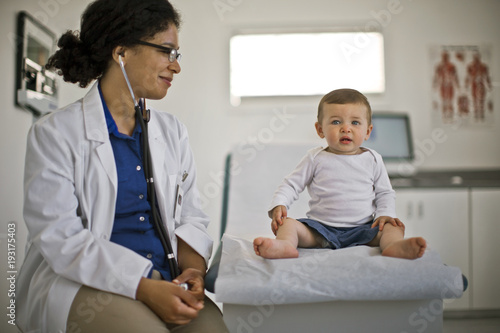 doctor, physician, patient, african american, caucasian, woman, mid, adult, baby, boy, to sit, look, smile, happiness, cute, hospital, bed, stethoscope, health care, science, medicals, lifestyle, front, labcoat, alone, indoor, people