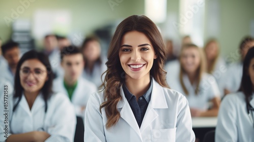 female doctor, nurse, portrait image standing in the front row of a medical education class or lecture room, grinning, confident, and content
