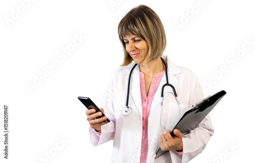 doctor, female, smartphone, clipboard, health care, medicals, technology, medicine, health, hospital, professional, woman, using, holding, mobile, communication, transparent, background, isolated, clinic, consultation, online, digital, app, patient, care, record, prescription, diagnosis, treatment, exam, stethoscope, laboratory, coat, men at work, modern