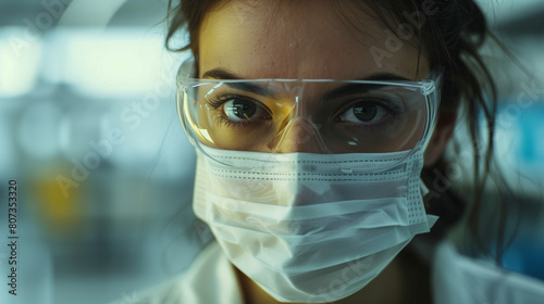Female doctor with a face mask. Doctor wearing PPE. Healthcare lab tech professional wearing goggles and a filter face mask in a hospital. Portrait of a Latina woman surgeon looking at the camera.