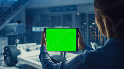Female Engineer Holds a Tablet Computer with Green Screen Mock Up and Looks at Electric Car Chassis Prototype with Wheels, Batteries and Engine Standing in a High Tech Development Laboratory.