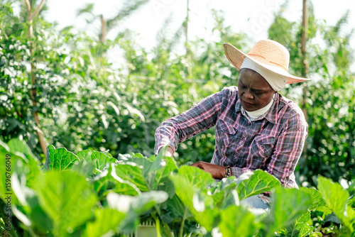 Female Farmer Harvesting Vegetables in a Lush Green Garden