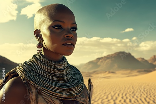 desert, woman, traditional, attire, sunset, jewellery, confidence, landscape, mountain, beauty, sand, portrait, culture, nature, horizon, serene, expression, elegance, artistry, exploration, identity, head, accessory, skin, tone, peaceful, immensity, dusk, sunlight, heritage, dramatic, warmth, environment, majestic, solitude, atmosphere, african, scenery, style, calm, ancient, timeless, allure