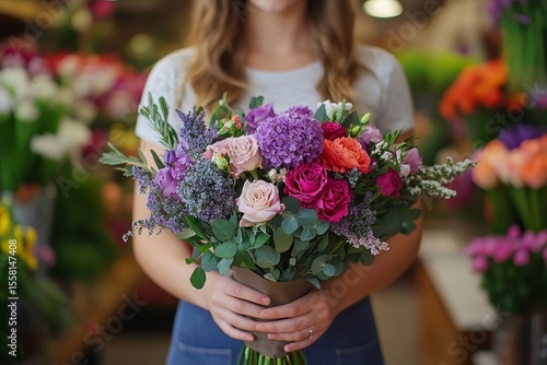 Female florist crafting a beautiful floral arrangement, selecting flowers with care and attention to detail for a custom order, Generative AI