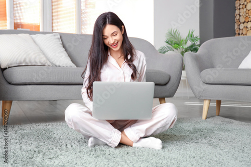 Female freelancer in pink pajamas working with laptop on carpet at home