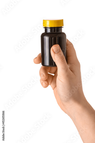 Female hand and medical bottle on white background