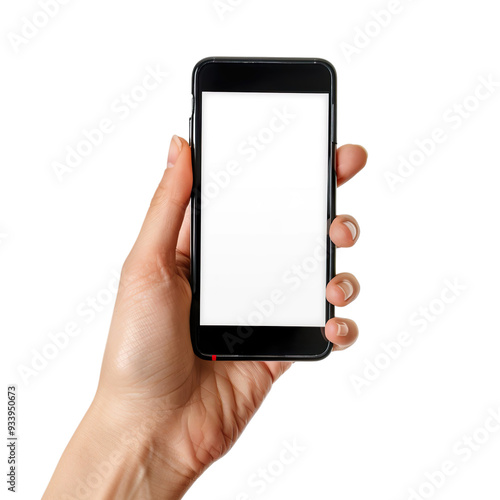 Female hand holding a smartphone with a blank screen Isolated on transparent background. Studio shot