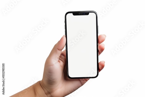 Female hand holding black cell phone smartphone with blank white screen and modern design isolated on white background. Mockup phone. Woman's Hand Holding Smartphone With Blank Screen, mockup phone