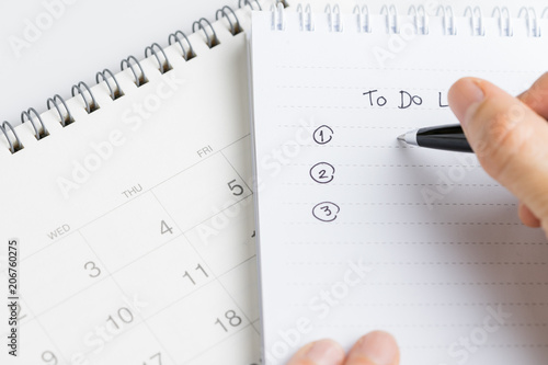 Female hand holding black pen writing To Do List prioritized by number on white paper notepad with desktop calendar date on white office table