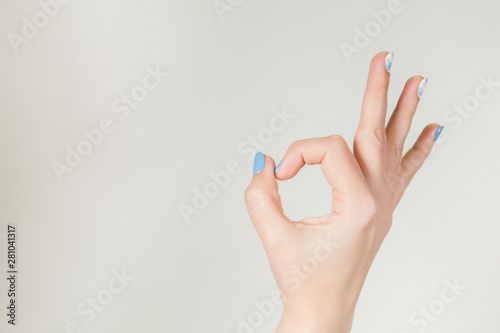 Female hand in ok symbol or zero gesture. Horizontal color photography.