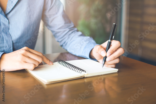 Female hand is writing on notepad with pen in office.