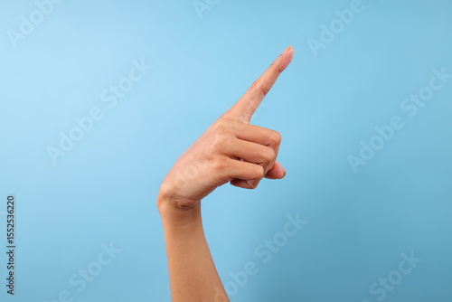 hand, pointing, finger, 1, up, blue, background, isolated, gesture, pointing, direction, showing, single, raised, human, part, body, communication, nonverbal, number, first, counting, select, choose, guide, studio, shot, photo, photo, graphic, resource, detail, clean, simple, arm, skin, caucasian, female, woman, girl, young, adult, neutral, calm, serene, message, attention, sharpened, teaching