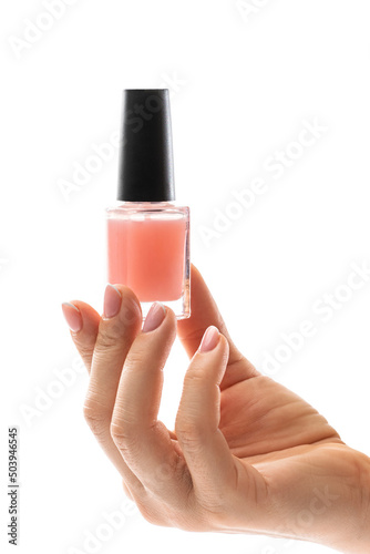 Female hand with beautiful french manicure holding bottle of pink nail polish against white background