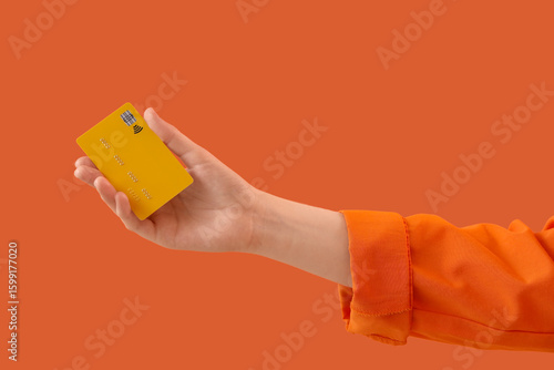 Female hand with credit card on orange background