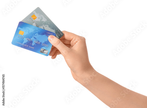 Female hand with credit cards on white background