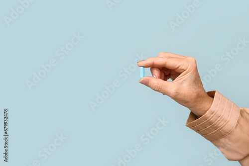 Female hand with pill on blue background