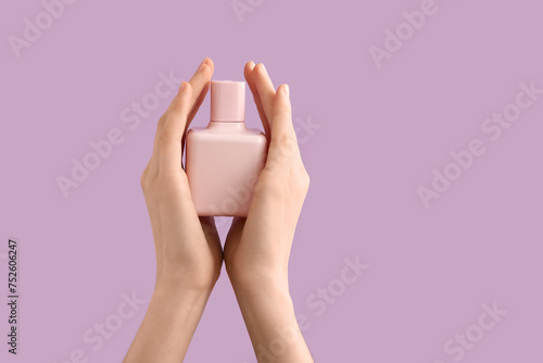 Female hands holding pink bottle of perfume on lilac background
