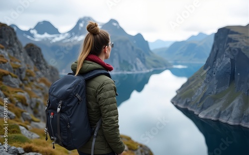 Female hiker in Norway, enjoying the view from a mountain cliff in Lofoten islands. High quality