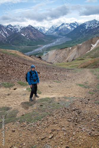Female hiker on Cathedral Mountain, upper Teklanika River, Denali National Park, Alaska, USA
