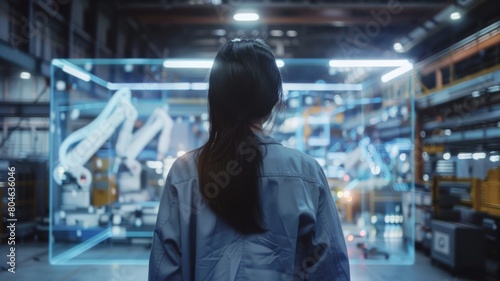 Female in coveralls with her back turned Standing at Electronics Factory. Augmented Reality Visualization of a Conveyor Belt Production Line with Robot Arms