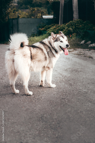 Female Malamute, a huge friendly Northern sled dog breed. Grey fluffy Alaskan Malamute stands and rests in the Park on the paved road.