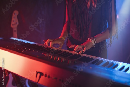Female playing piano in illuminated nightclub