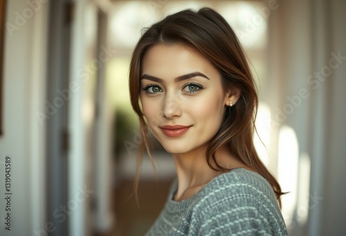 styled, female, gaze, low, high, noise, subtile, mood, copy, professional, smile, doorway, calm, texture, illumination, space, human, portrait, soft, aesthetic, shallow, quality, eye, light, background, image, depth, direct, atmosphere, people, blurred, face, naturally, resolution, detail, field, hair, sharpened, natural, photorealistic, photo, serene, blur