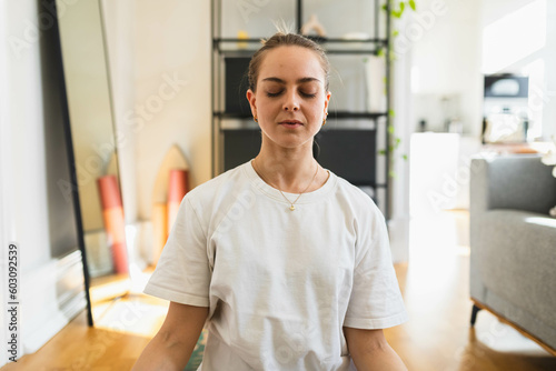 Female practising yoga at home