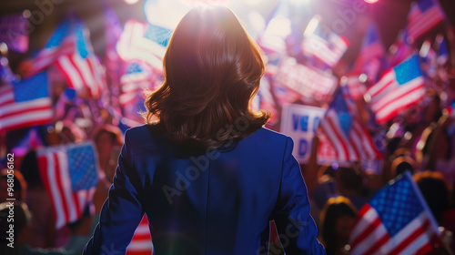 presidential, rally, president, female, politician, political, blue, suit, dark, hair, from behind, back, speaking, public, party, election, season, vote, woman