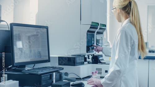 Female Research Scientist Working with Medical Analyzing Machine for Testing Tubes with Blood Sample. Scientist Works in Innovative Pharmaceutical Genetic Research Laboratory.