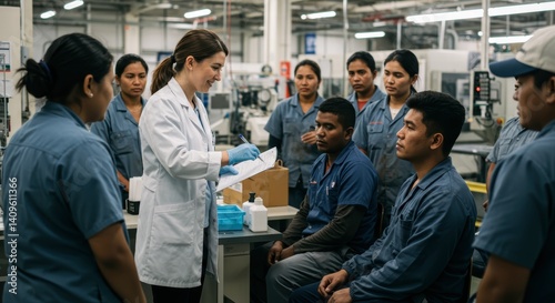 Female Scientist Leading a Team Meeting in a Factory Setting