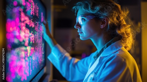 Female scientist wearing a lab coat and protective glasses analyzes complex data on a large interactive screen in a vibrant, high tech laboratory
