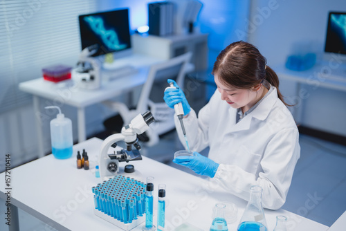 Female scientist working in a laboratory, using a pipette and petri dish, focused on research amid scientific equipment and DNA sequences on computer screens