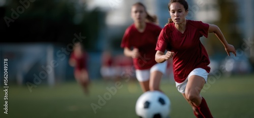 Female soccer players are captured in intense match action on a green field. Concept of teamwork, athleticism, and competition in women sports.