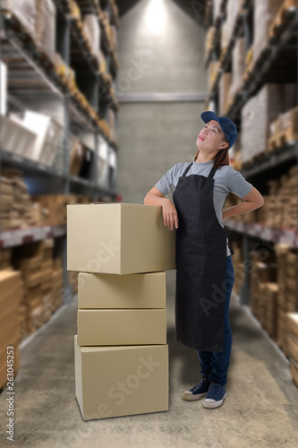 Female staff Lifting parcel boxes worker having a backache in the warehouse