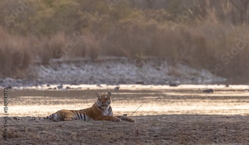 Female tigress (Panthera tigris) near river at jim corbett forest.