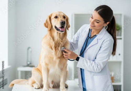 Female veterinarian examines Golden Retriever dog with stethoscope in clinic. professional doctor provides medical care to calm, healthy pet. veterinary medicine, animal health, professional pet care