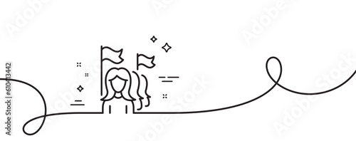Feminism line icon. Continuous one line with curl. Women protest sign. People with flags symbol. Feminism single outline ribbon. Loop curve pattern. Vector