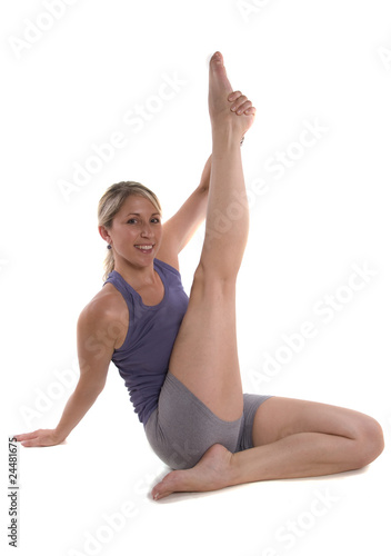 woman, sport, sportsman, flexible, flexible, muscle, weight training, split, stretching, relaxing, fitness, caucasian, blond, body, leg, white background, isolated, smile, smiling