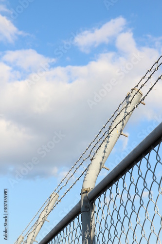 Fence with barbed wire and white clouds with blue sky in background