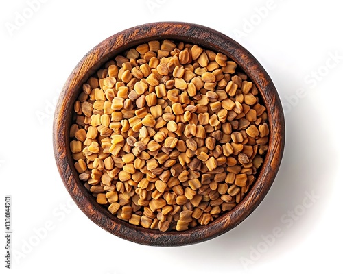 fenugreek, seed, spice, herb, food, ingredient, cooking, cookery, healthy, nourishment, dietary, organic, natural, botany, plant, agriculture, harvest, brown, yellow, bowl, wooden, texture, top, view, isolated, white, background, aromatic, favor, earthy, pungent, bitter, medicine, remedy, treatment