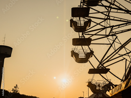 Ferris wheel gondolas at sunset in amusement park with water tower