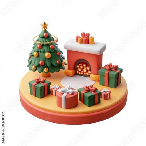 Festive 3D Rendered Christmas Scene Christmas Tree, Fireplace, and Presents