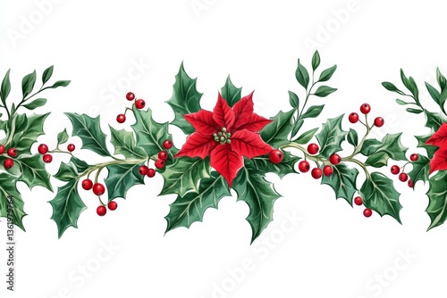 Festive arrangement of holly and poinsettias for holiday decoration and celebration