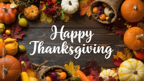 Festive Autumn Pumpkin Leaf and Fruit Border of happy thanksgiving day text