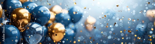 Festive Celebration with Blue and Gold Balloons and Confetti in a Sparkling Background