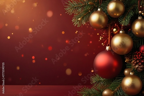 Festive christmas background with golden and red ornaments hanging on a christmas tree branch with bokeh lights