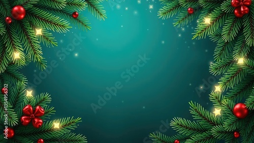 Festive Christmas border framed by lush green pine branches and a dark teal background with shimmering stars, festive, winter wonderland, shimmering stars