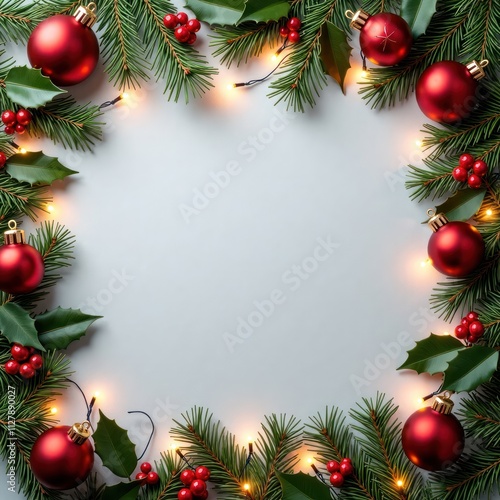 Festive Christmas border made of pine branches holly berries, red ornaments. Warm glowing lights create festive frame on white linen background. Top down view holiday decor in square composition