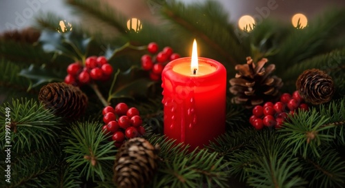 Festive christmas candle with red berries and pine cones surrounded by green fir branches